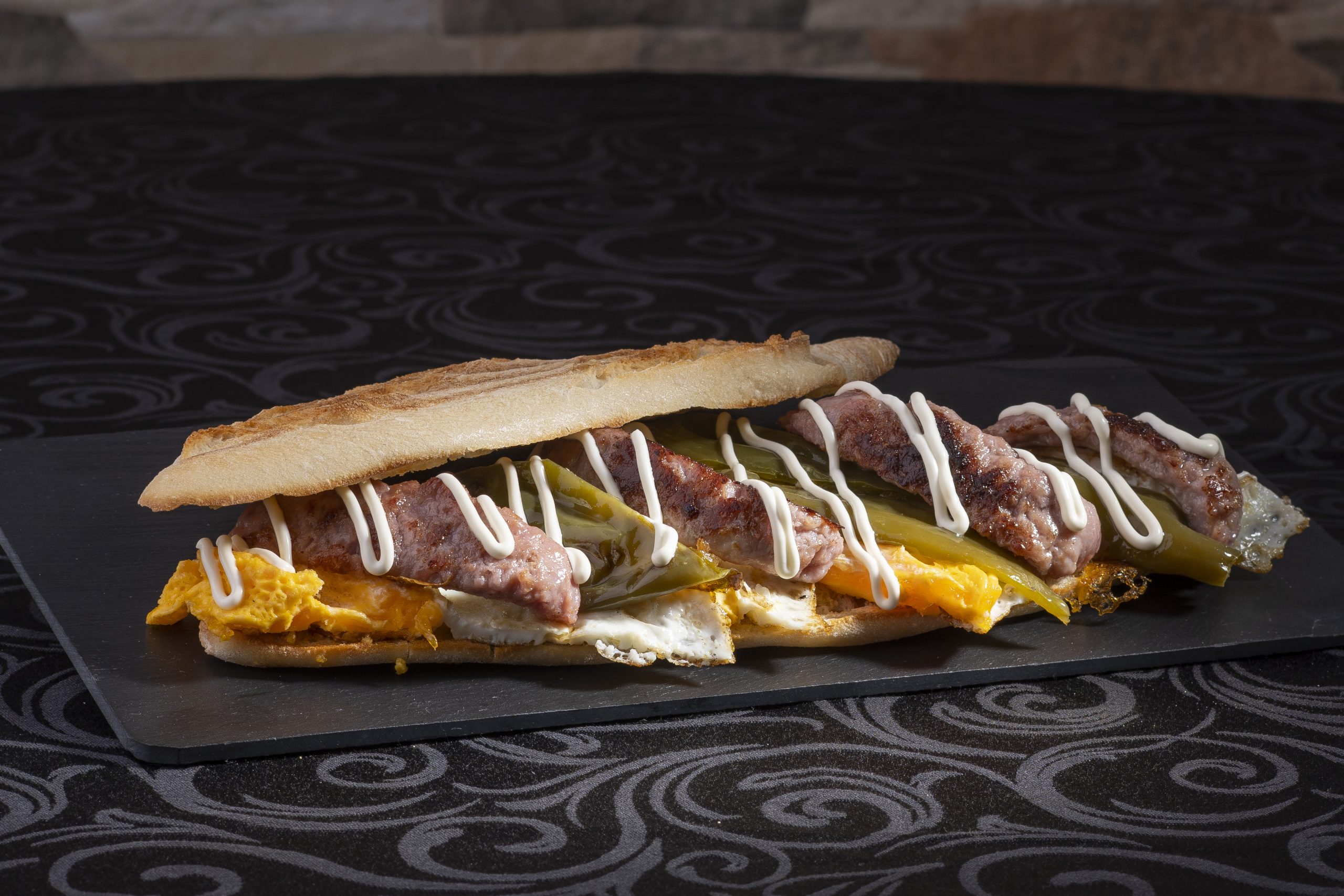 Huevo plancha, longaniza blanca, pimiento verde y mayonesa