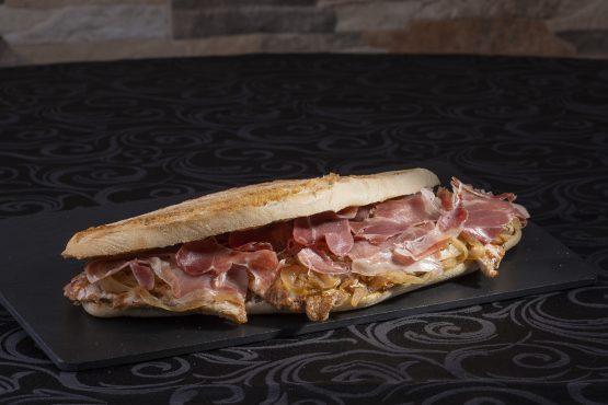 Jamón serrano, lomo fresco y cebolla a la plancha