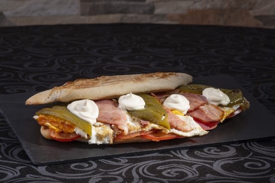 Tomate laminado, huevo plancha, beicon, pimiento verde y mayonesa
